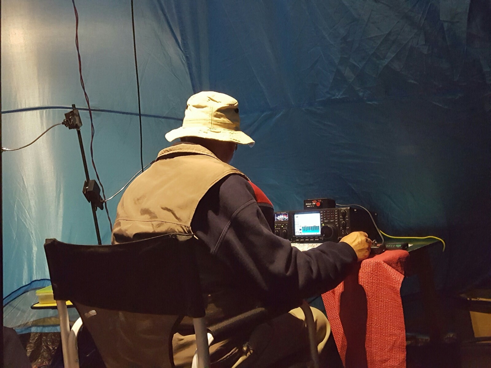 The tent was a wigwam and was installed easily and we used the club 756 pro2 which did not require an atu to tune the antenna. Also we used my computer for logging and we had problems to read it in the bright sun partially solved by making the characters white on a black background. Also a screen on the outside of the tent to block the sun helped most.