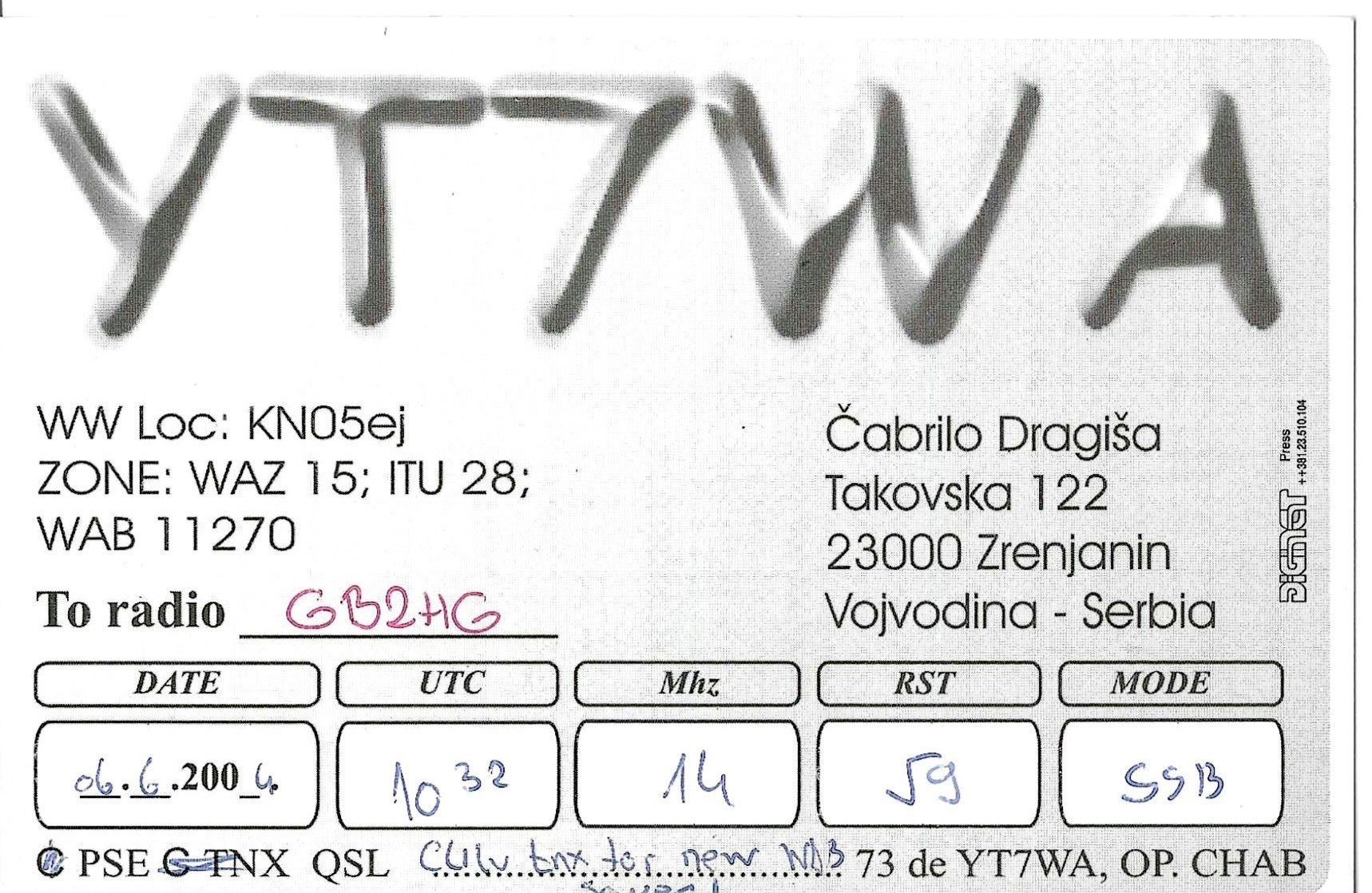 YT7WA - 06/06/2004 - 20M - SSB - 59