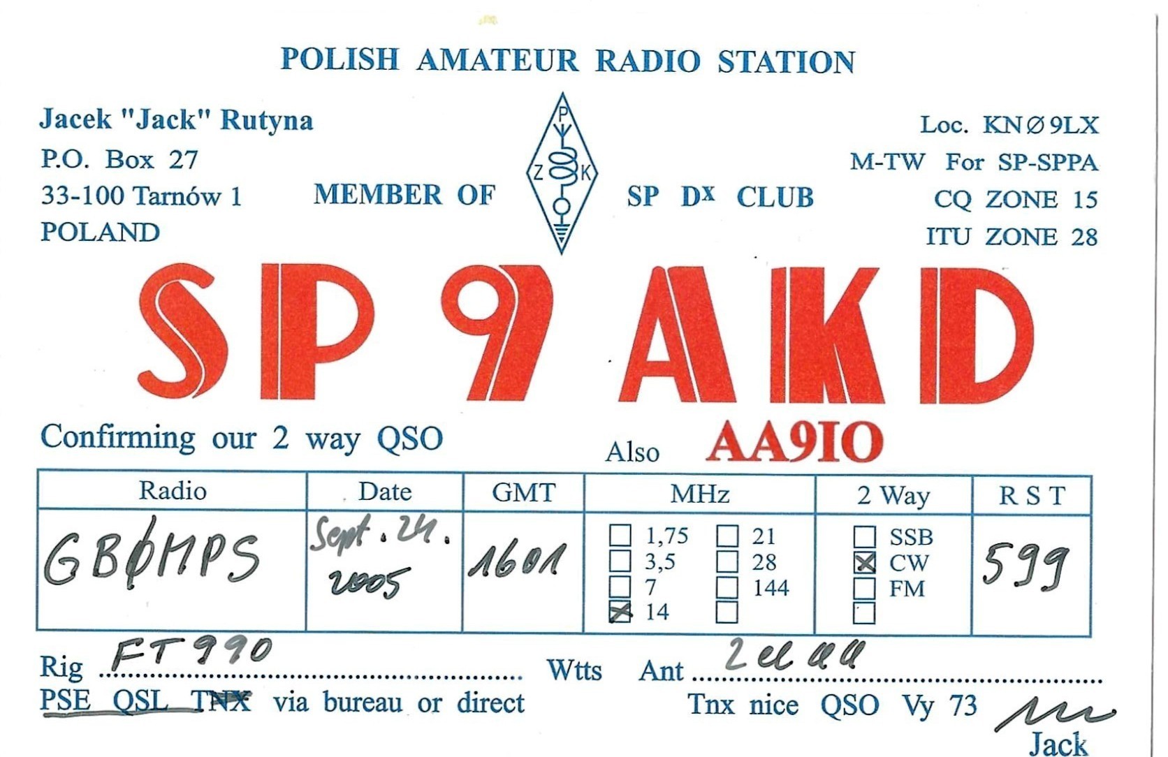 SP9AKD - 24/09/2005 - 20M - CW - 599